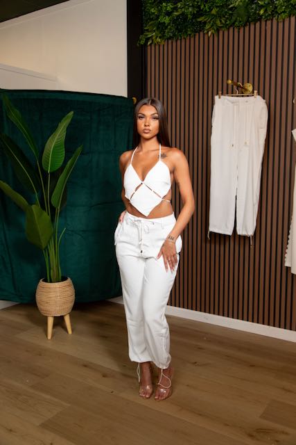 These white pants feature a lightweight, flowy fabric complemented by elegant gold hardware, making them an ideal choice for sophisticated summer style. Their breathable design ensures comfort while maintaining a polished look perfect for warm-weather occasions.